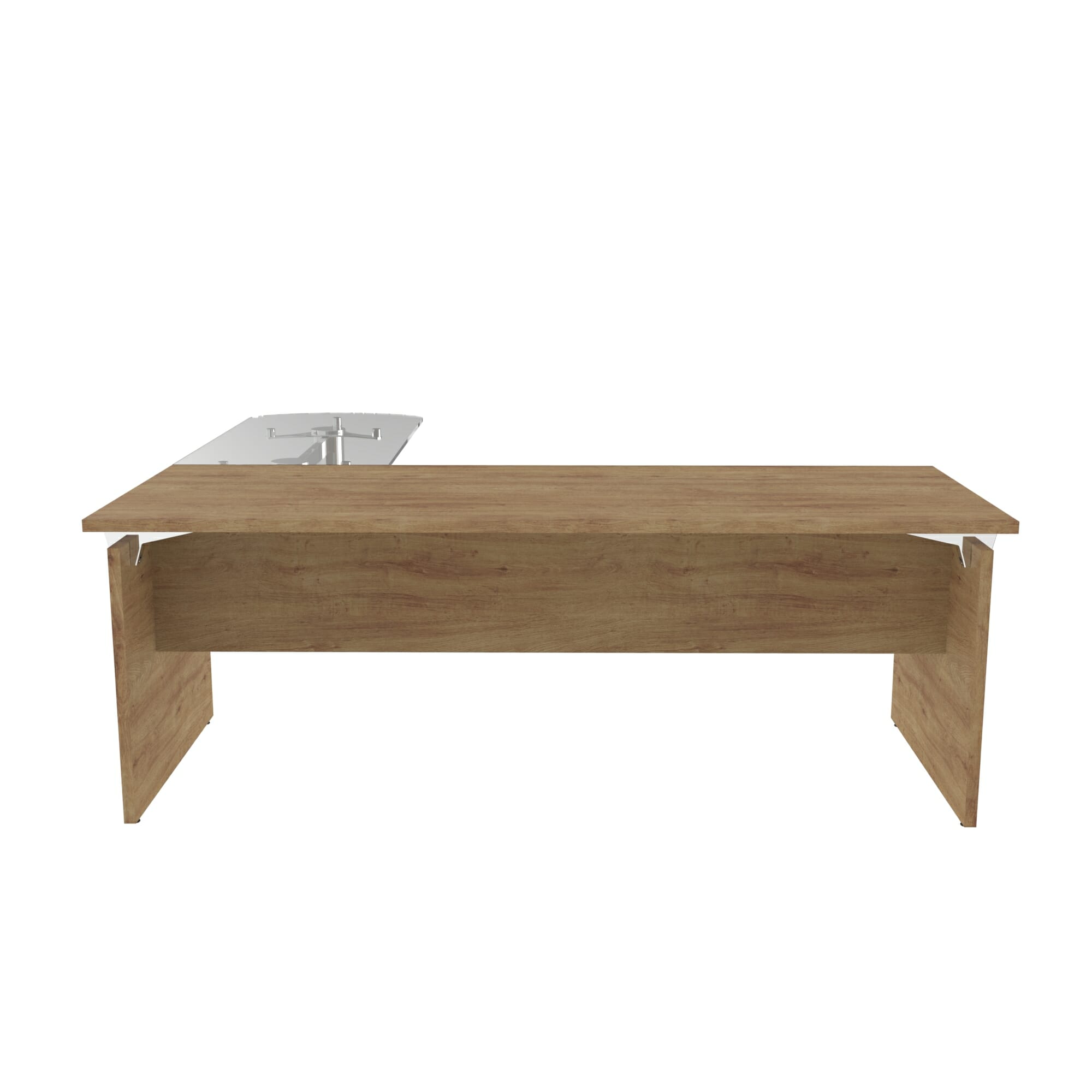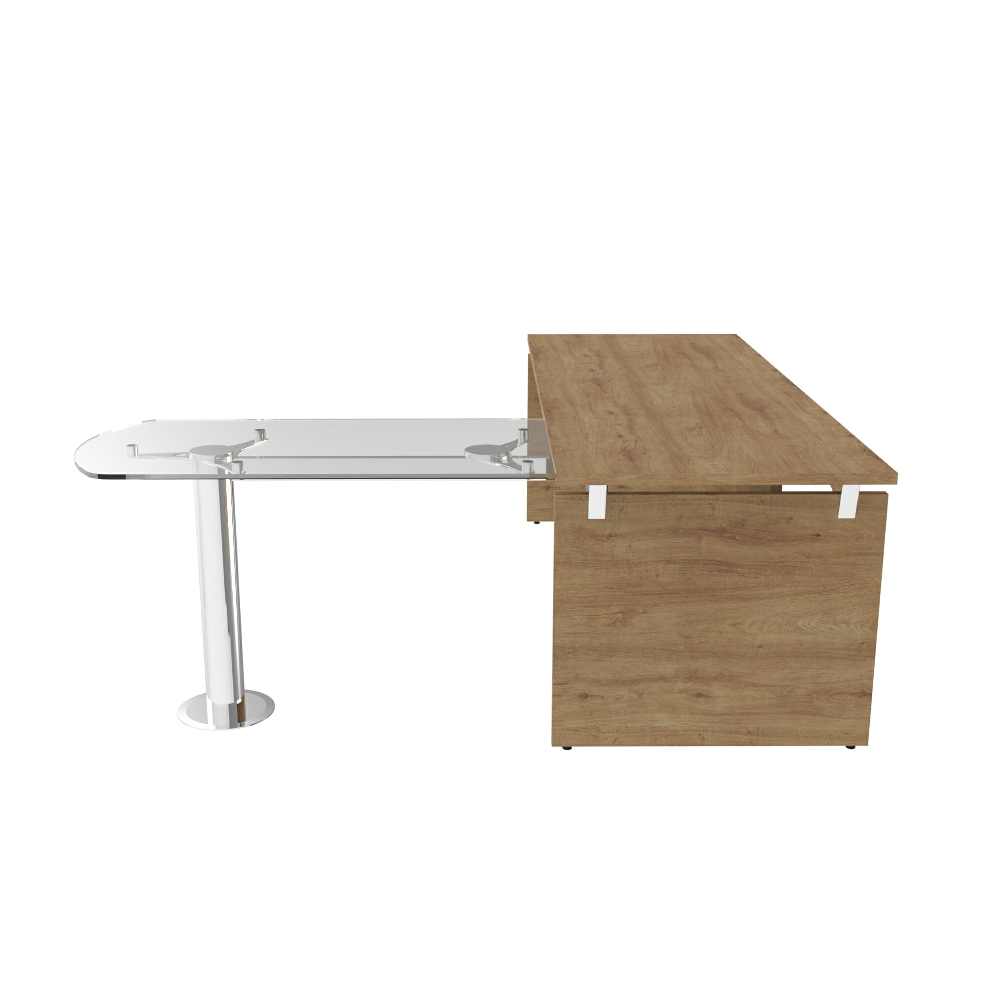 Este elegante escritorio es ideal para oficinas directivas y ejecutivas ya que es una mezcla perfecta de estilo y funcionalidad. Cuenta con una extensión de cristal lo que aligera el aspecto visual del mueble. Su construcción es fuerte y durable, óptimo para resistir el trabajo diario. Puede utilizarse con los sillones ejecutivos Kahlo y KB-0.