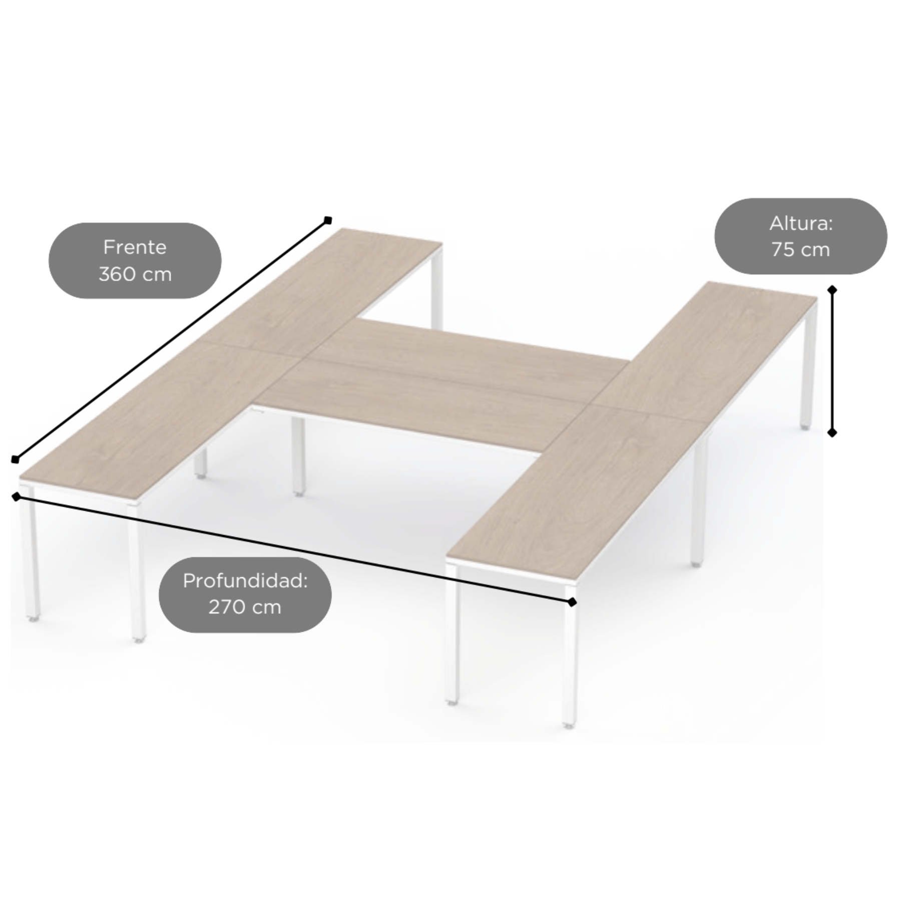 La configuración en "H" es perfecta para usuarios multitarea: optimiza el espacio, impulsa la colaboración con compañeros y crea un entorno de trabajo versátil y  productivo.