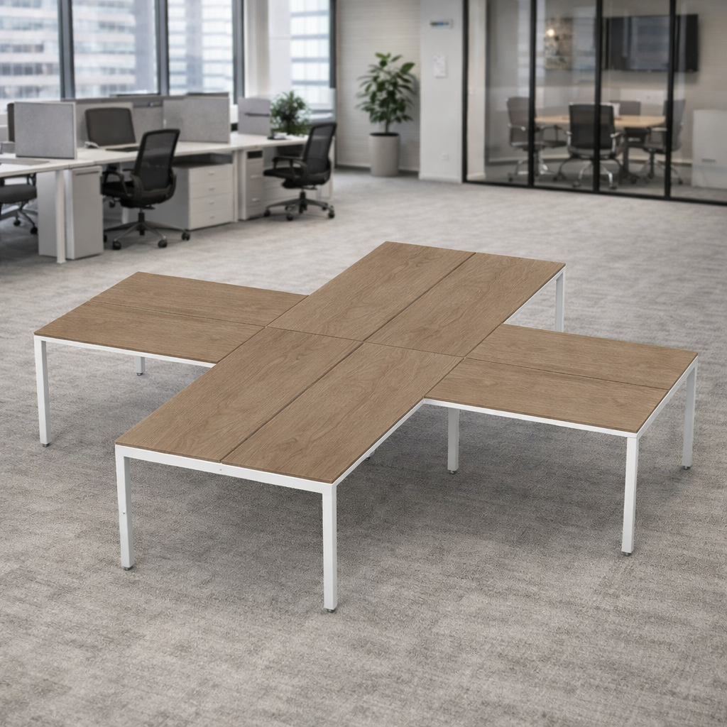 Escritorio para 4 personas/configuración en “X” by Billydesk es la opción ideal para usuarios multitarea que buscan rendimiento y comodidad. Su diseño optimiza el espacio, fomenta la colaboración inmediata entre compañeros y transforma cualquier área en un entorno de trabajo dinámico, versátil y altamente productivo.