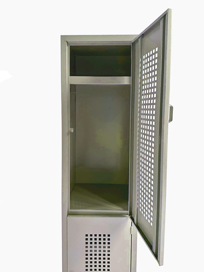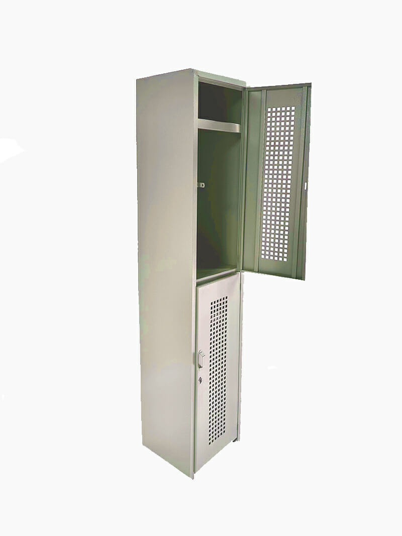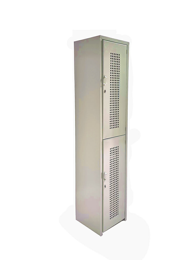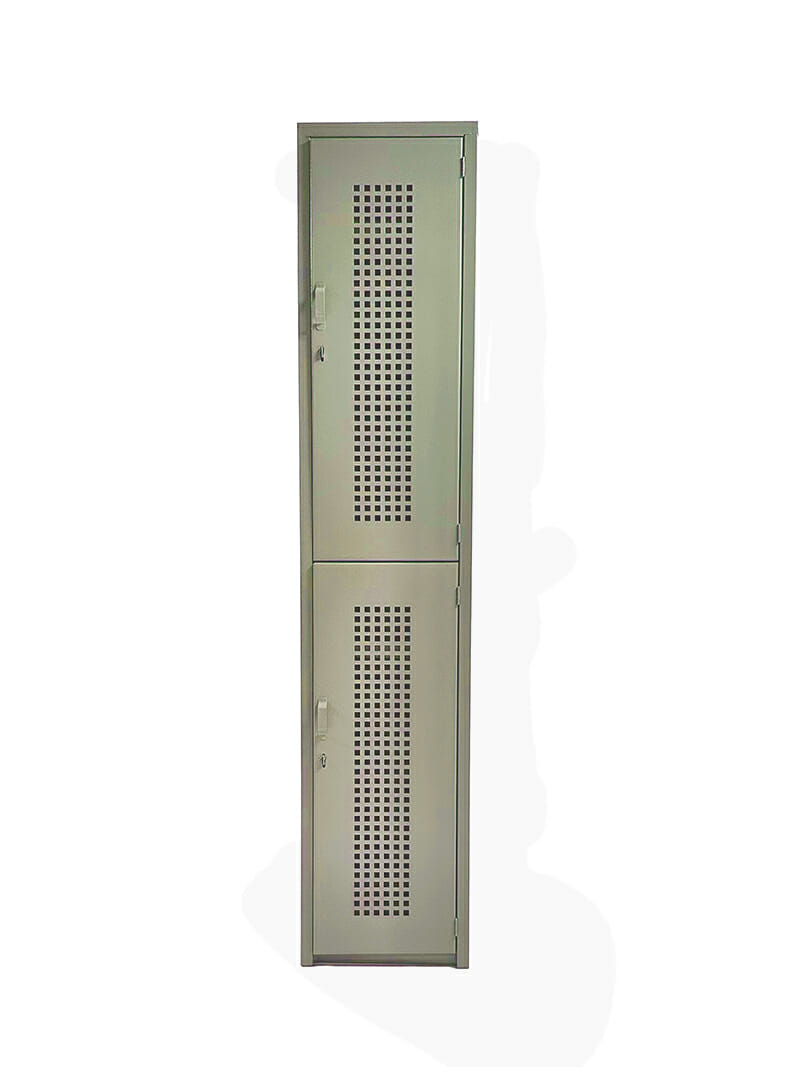 Locker perforado de 2 puertas está diseñado con medidas estándar que permiten ofrecer un precio competitivo sin comprometer la calidad ni la durabilidad. Fabricado en lámina calibre 24, brinda resistencia y funcionalidad para el uso diario en entornos industriales, corporativos o educativos. Cuenta con dos juegos de rejillas de ventilación tipo persiana, con cuatro aberturas cada una, que favorecen la circulación del aire y ayudan a mantener el interior ventilado. Además, la línea dispone de lockers de mayor amplitud para adaptarse a distintas necesidades de almacenamiento.