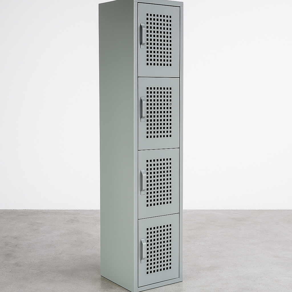 Locker perforado de 4 puertas está diseñado con medidas estándar que permiten ofrecer un precio competitivo sin comprometer la calidad ni la durabilidad. Fabricado en lámina calibre 24, brinda resistencia y funcionalidad para el uso diario en entornos industriales, corporativos o educativos. Cuenta con dos juegos de rejillas de ventilación tipo persiana, con cuatro aberturas cada una, que favorecen la circulación del aire y ayudan a mantener el interior ventilado. Además, la línea dispone de lockers de mayor amplitud para adaptarse a distintas necesidades de almacenamiento.
