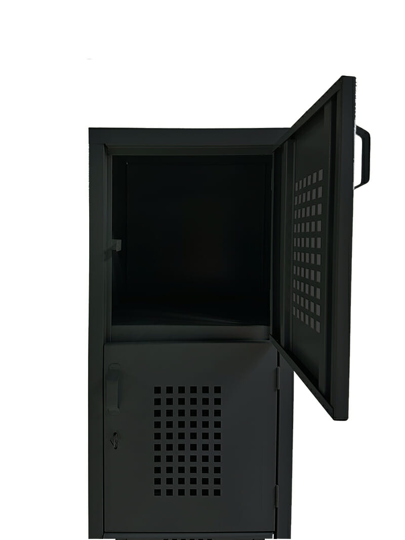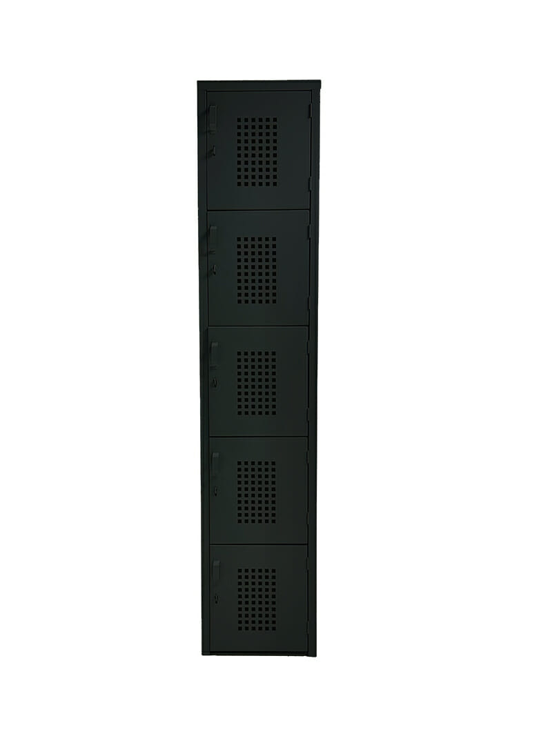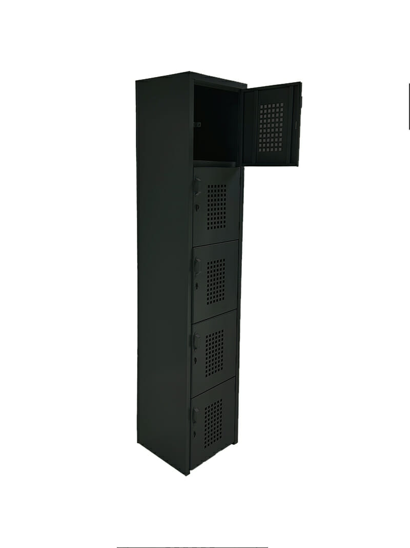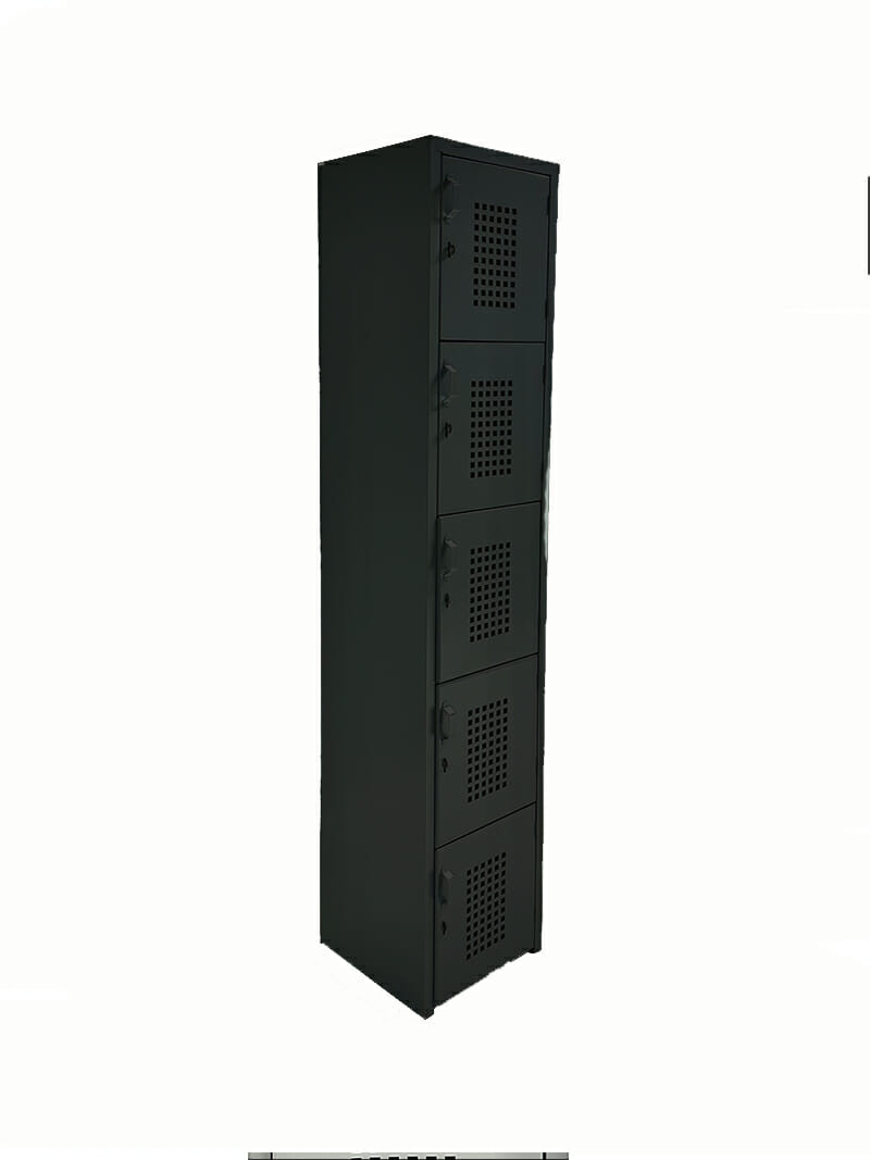 Locker perforado de 5 puertas está diseñado con medidas estándar que permiten ofrecer un precio competitivo sin comprometer la calidad ni la durabilidad. Fabricado en lámina calibre 24, brinda resistencia y funcionalidad para el uso diario en entornos industriales, corporativos o educativos. Cuenta con dos juegos de rejillas de ventilación tipo persiana, con cuatro aberturas cada una, que favorecen la circulación del aire y ayudan a mantener el interior ventilado. Además, la línea dispone de lockers de mayor amplitud para adaptarse a distintas necesidades de almacenamiento.