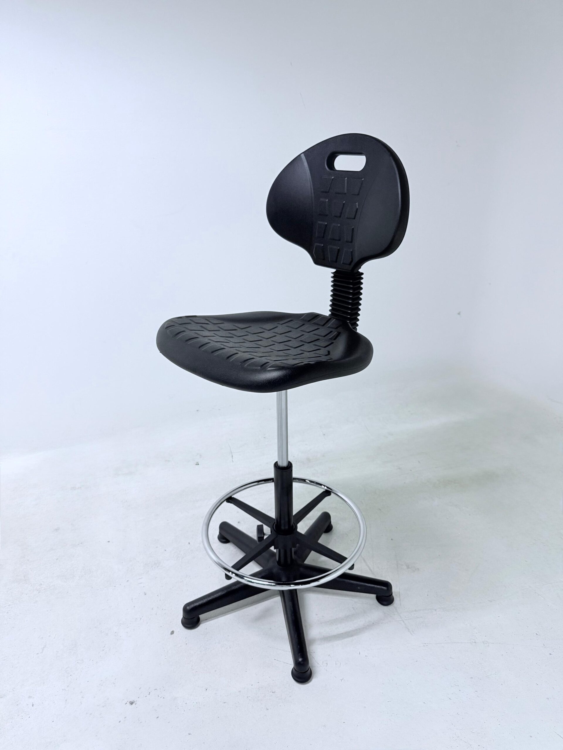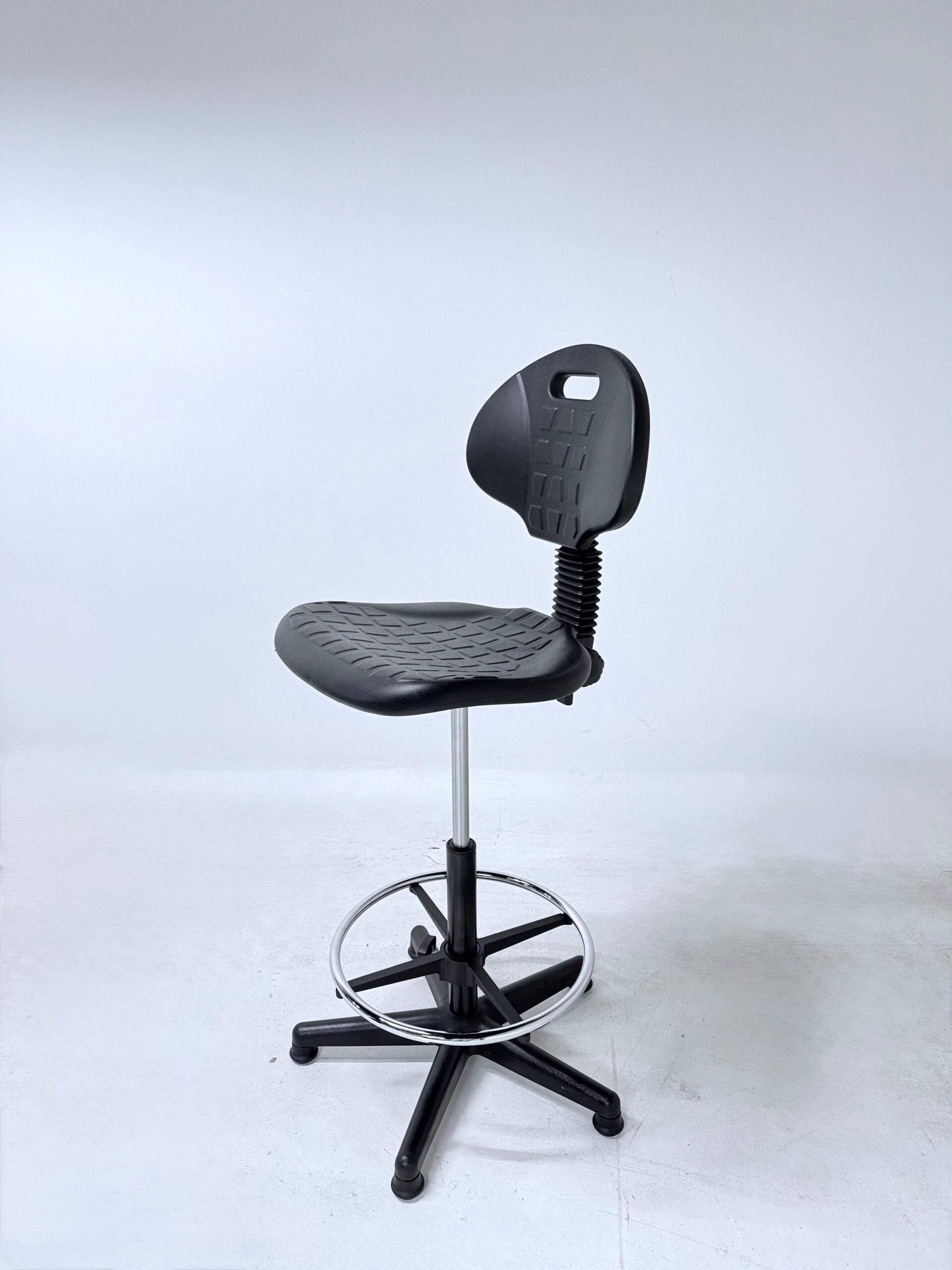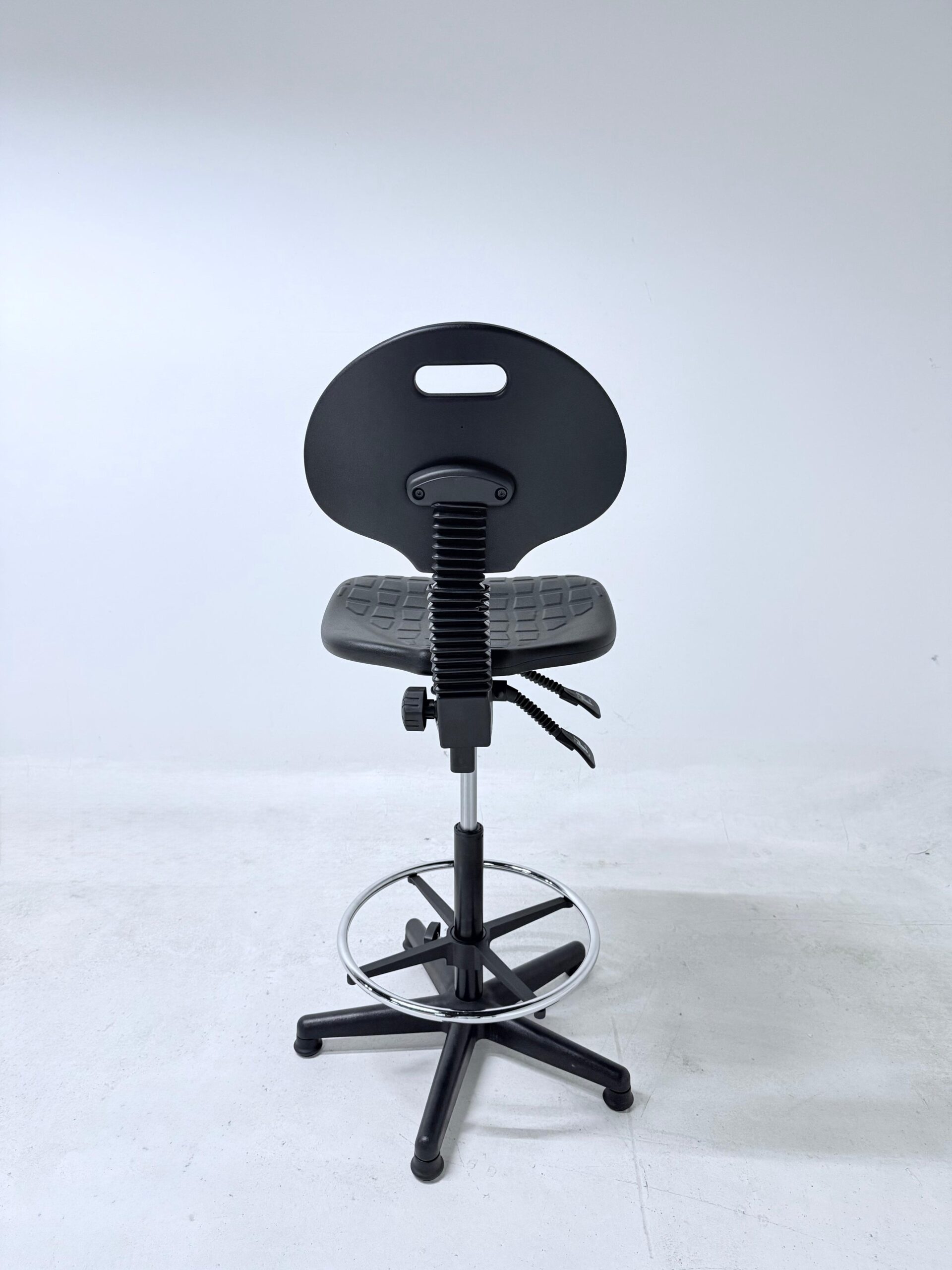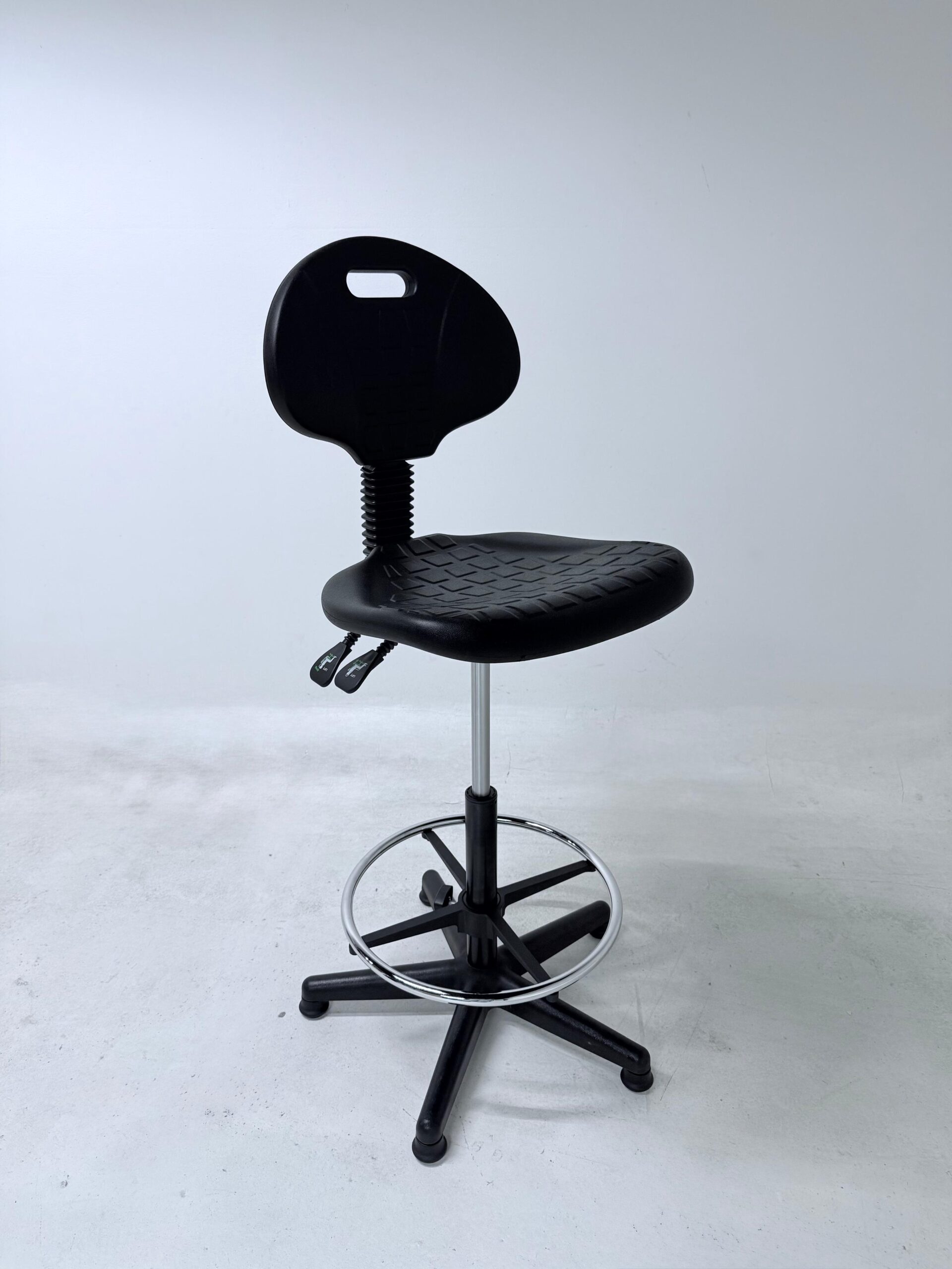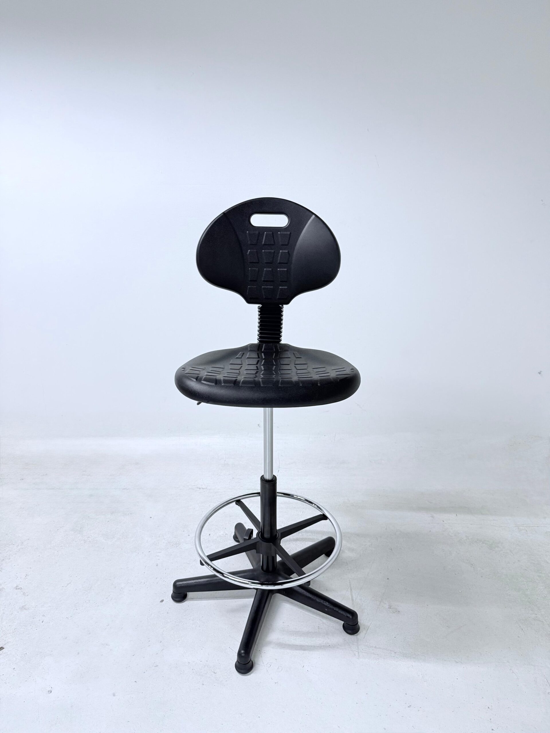 Silla cajero sin brazos de estilo industrial está diseñada para ofrecer funcionalidad, resistencia y confort en espacios de trabajo que requieren mayor altura de asiento. Su estructura robusta con aro descansapiés cromado brinda estabilidad y apoyo ergonómico durante jornadas prolongadas. Equipada con doble palanca de ajuste, permite regular la altura y el mecanismo según las necesidades del usuario, favoreciendo una postura adecuada. El regatón en la base proporciona firmeza y protección al piso, haciéndola ideal para áreas industriales, mostradores, estaciones de trabajo técnicas o entornos comerciales.