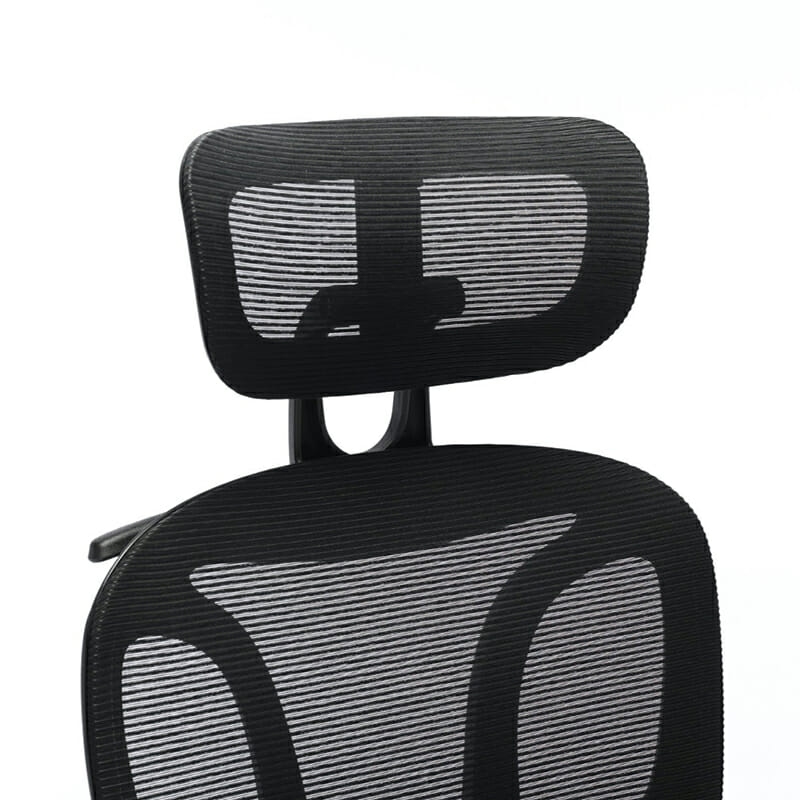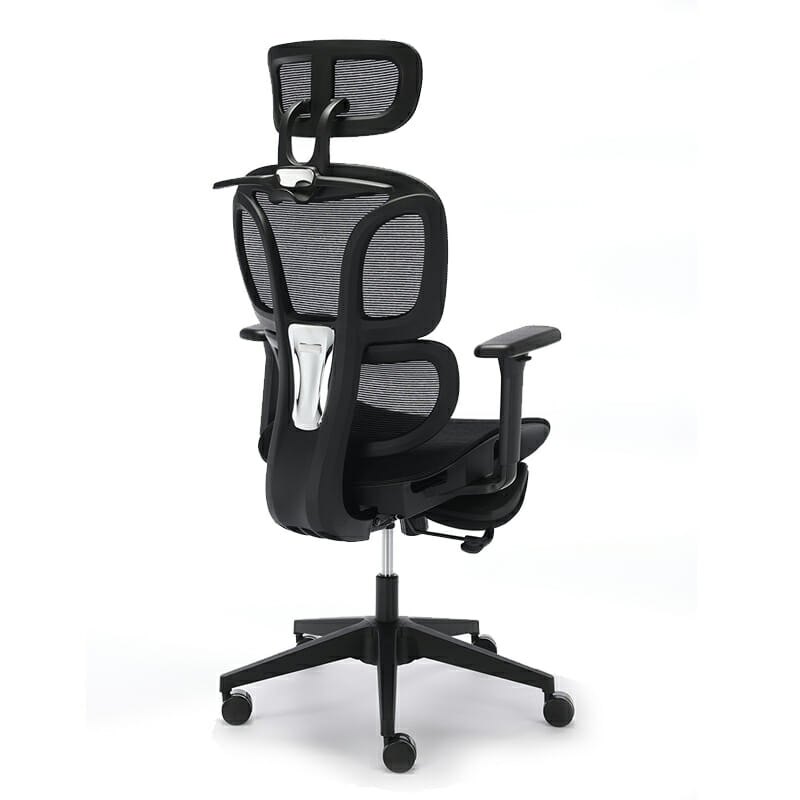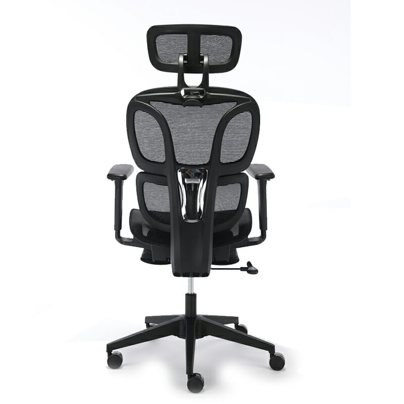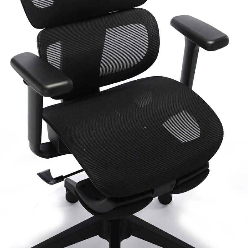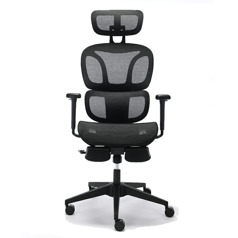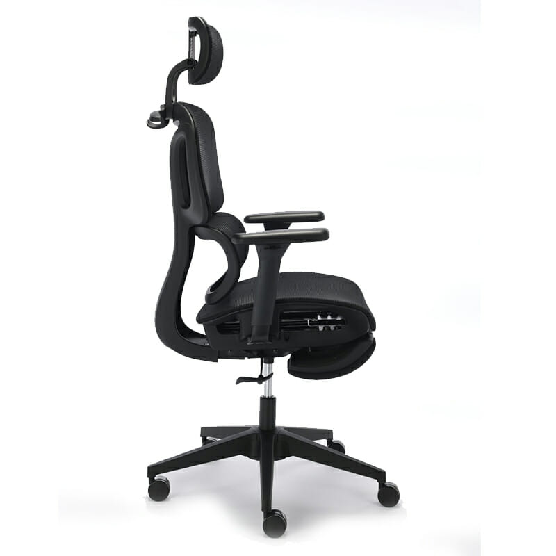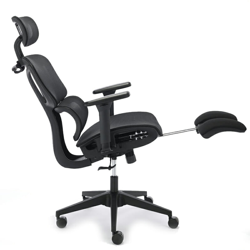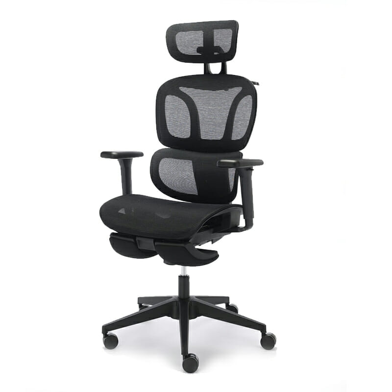 Silla ejecutiva ergonómica con respaldo de mesh y descansapiés retráctil. Incluye cabecera ajustable en altura e inclinación, descansabrazos 3D y mecanismo autoajustable con 3 posiciones de inclinación y bloqueo.
