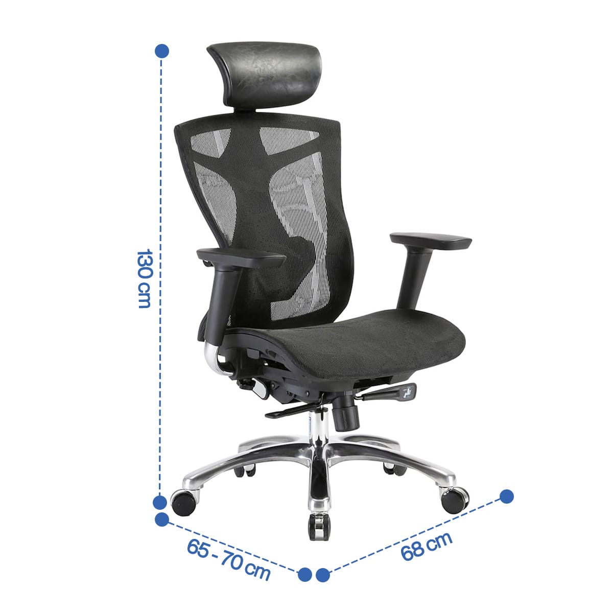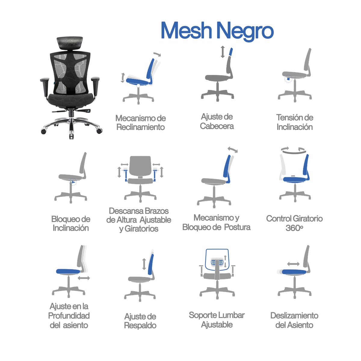 Silla ejecutiva ergonómica, ofrece respaldo en mesh negro que brinda frescura y soporte lumbar, asiento acolchado de alta densidad y base cromada de alta resistencia. Ajustes personalizables en altura, respaldo y reposacabeza.